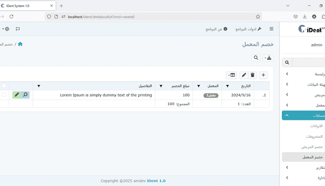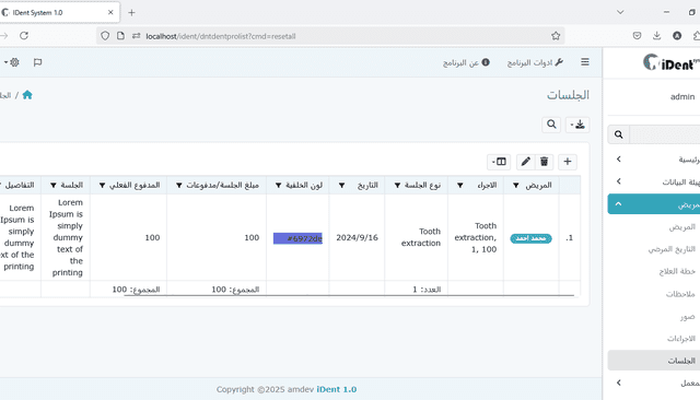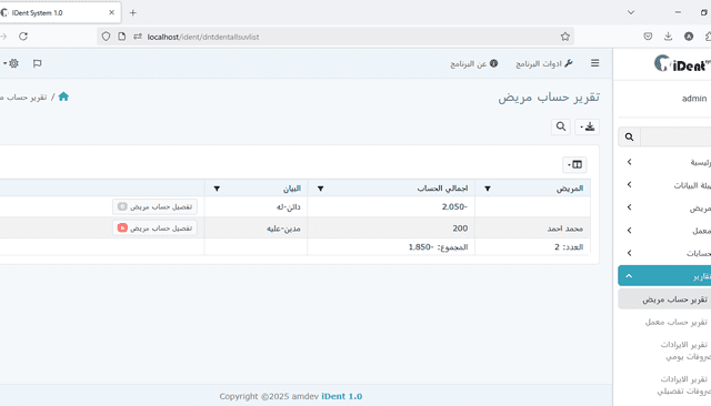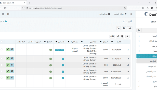 إدارة حسابات المرضى والمعامل: تتبع الوضع المالي لكل من المرضى ومختبر الأسنان. يدعم النظام تتبع الدفعات النقدية، وكذلك الدفعات الآجلة (الأقساط)، مما يسمح برؤية مالية واضحة.