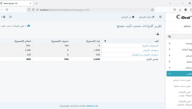 تقرير تفصيلي يقسم إيرادات العيادة ونفقاتها حسب الفئة، مما يسمح برؤية أكثر تفصيلاً للعمليات المالية.
