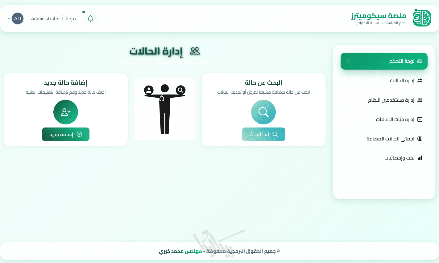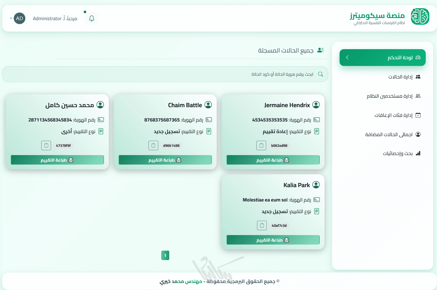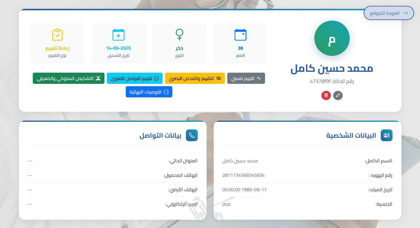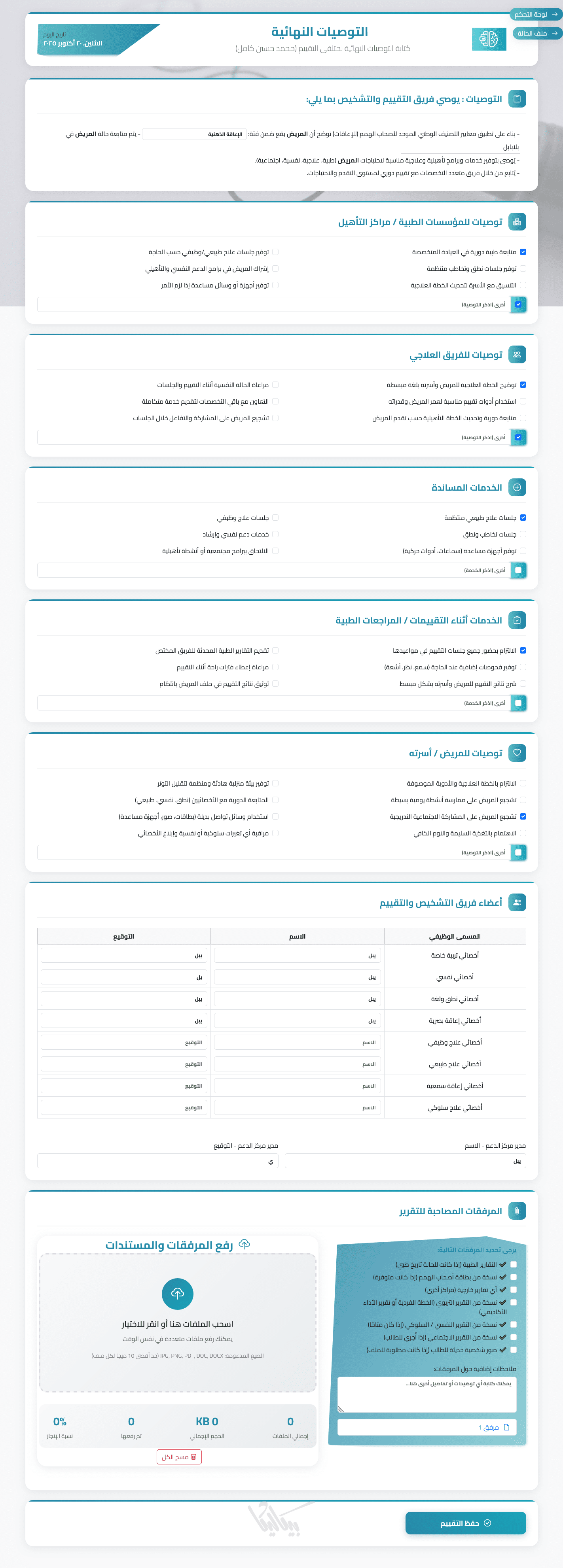 تختصر وقتك في تسجيل بيانات المرضى وحفظها رقميًا، تدير التقييمات بأنواعها بسهولة، تحصل على تقارير واضحة وتوصيات دقيقة تساعد في القرار العلاجي وتستفيد من لوحة تحكم مرنة تدعم سير العمل الطبي بكفاءة.