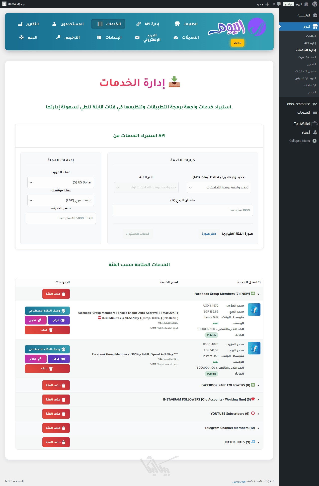 استيراد الخدمات تلقائياً من أي مزود خارجي عبر API بالوصف والسعر والحد الادني والاقصي وامكانية اضافة صورة لكل الكاتوجري وايضا تحويل العملات وتحديد هامش ربح متوافق مع عمله موقعك كل ذلك بضغطة زر واحدة