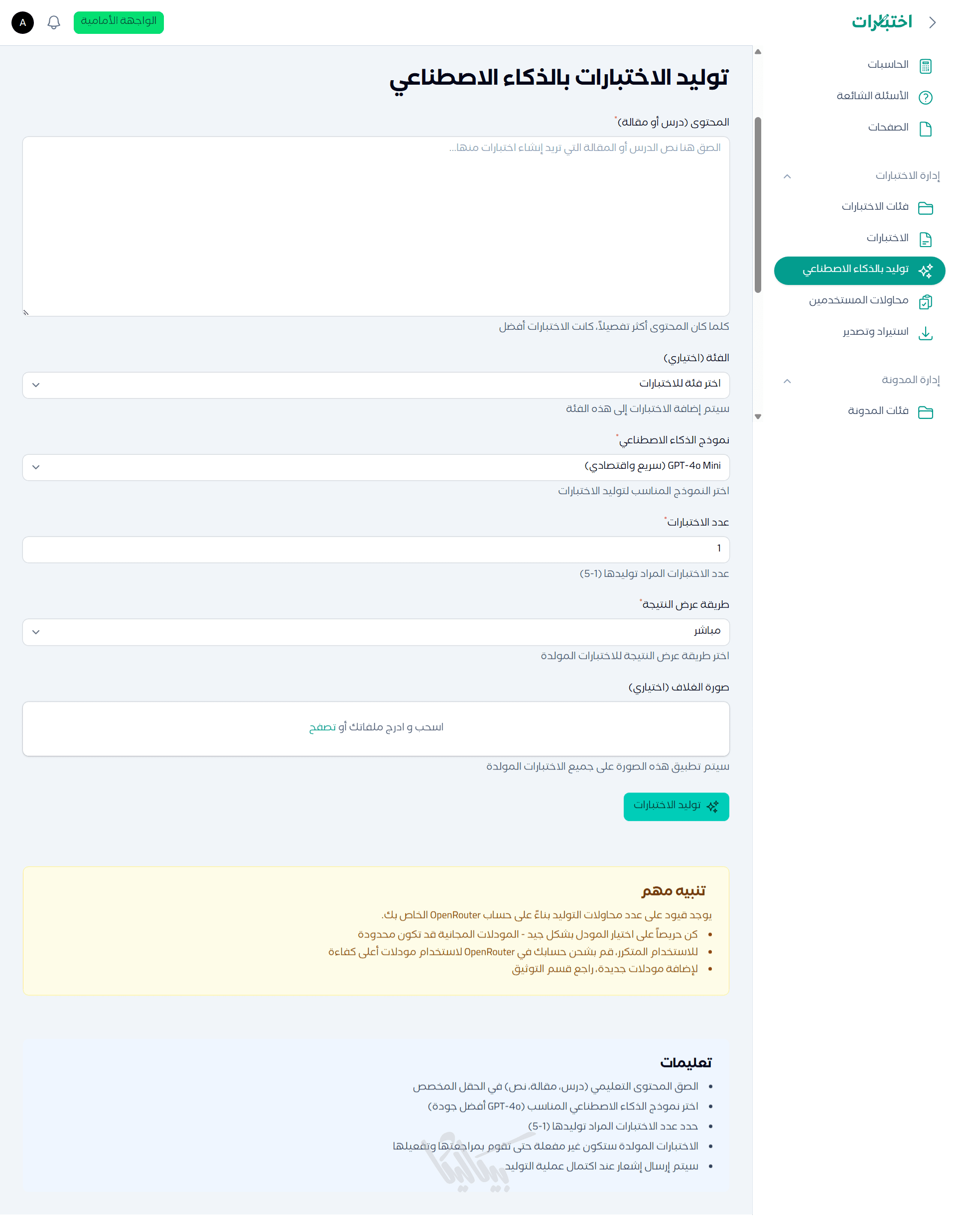 توليد الاختبارات للدروس والمقالات بالذكاء الاصنطناعي ومجانا