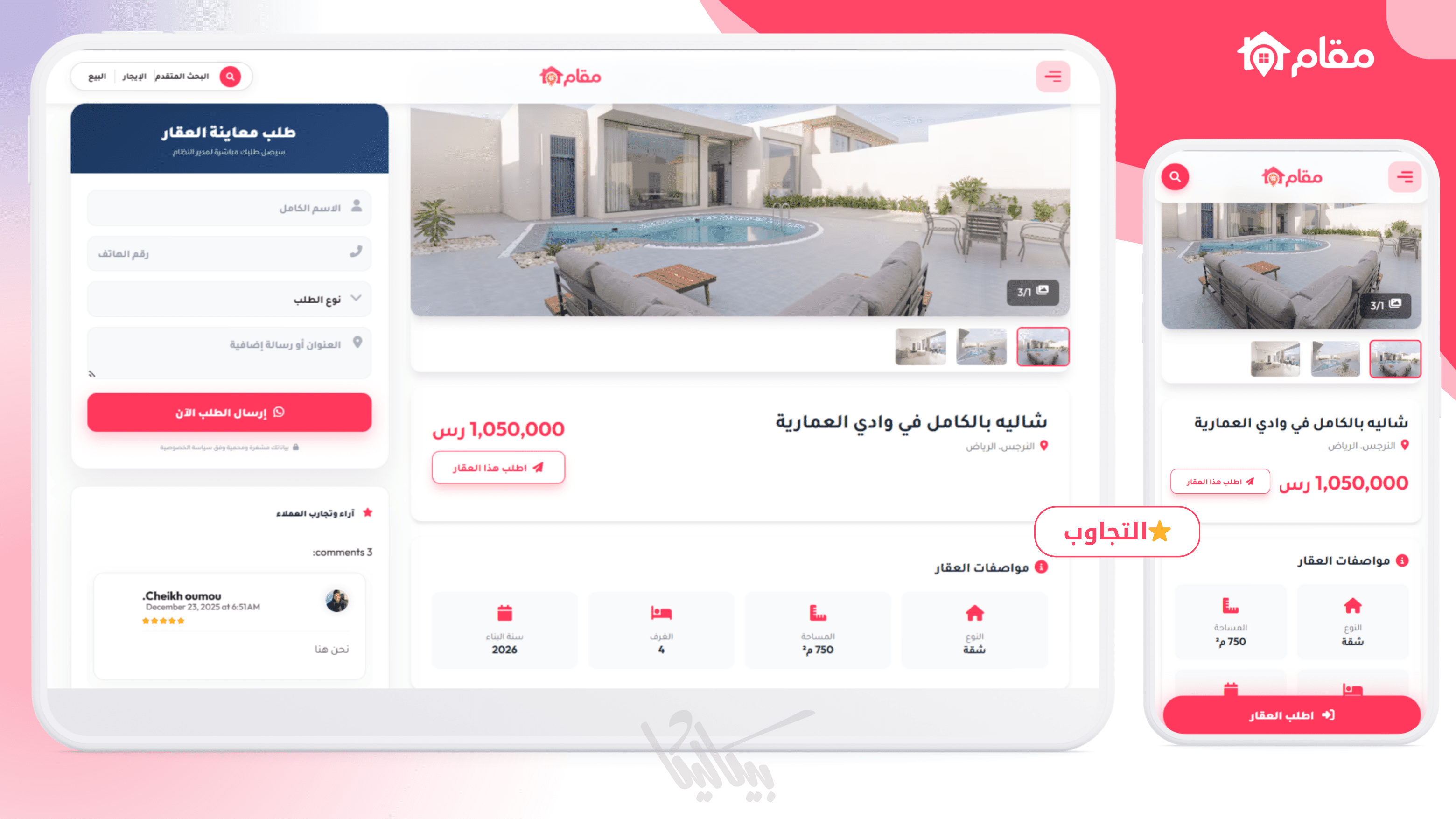 قالب مقام هو قالب عقاري متكامل التصميم خصيصاً لمنصات بلوجر، والذي يجمع بين الأناقة في التصميم والقوة في الأداء. "مقام" ليس مجرد قالب، بل هو واجهتك الرقمية التي تعكس الرقي والمصداقية لعملائك، ممكناً إياك من استعراض محفظتك العقارية بأسلوب عصري يأسر الأنظار ويضاعف المبيعات.