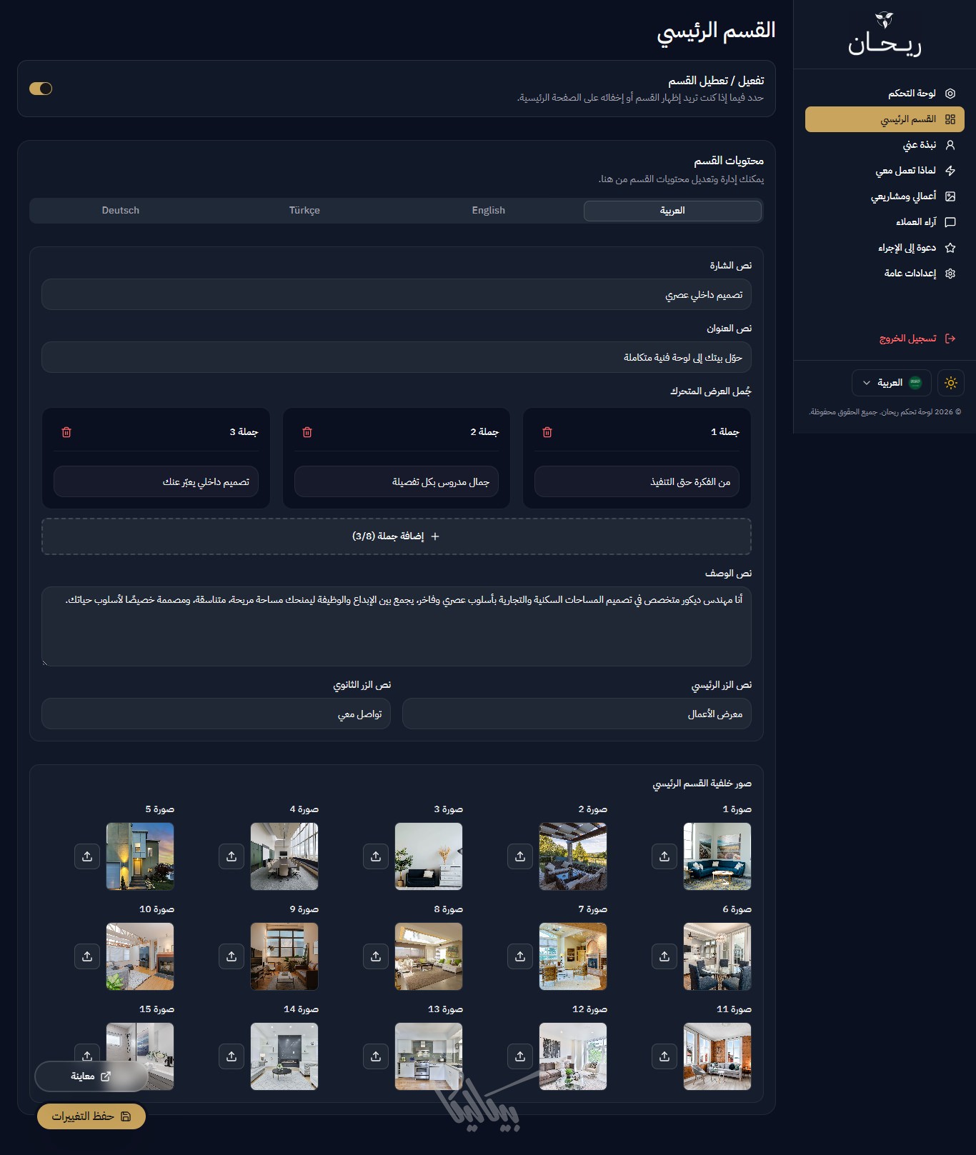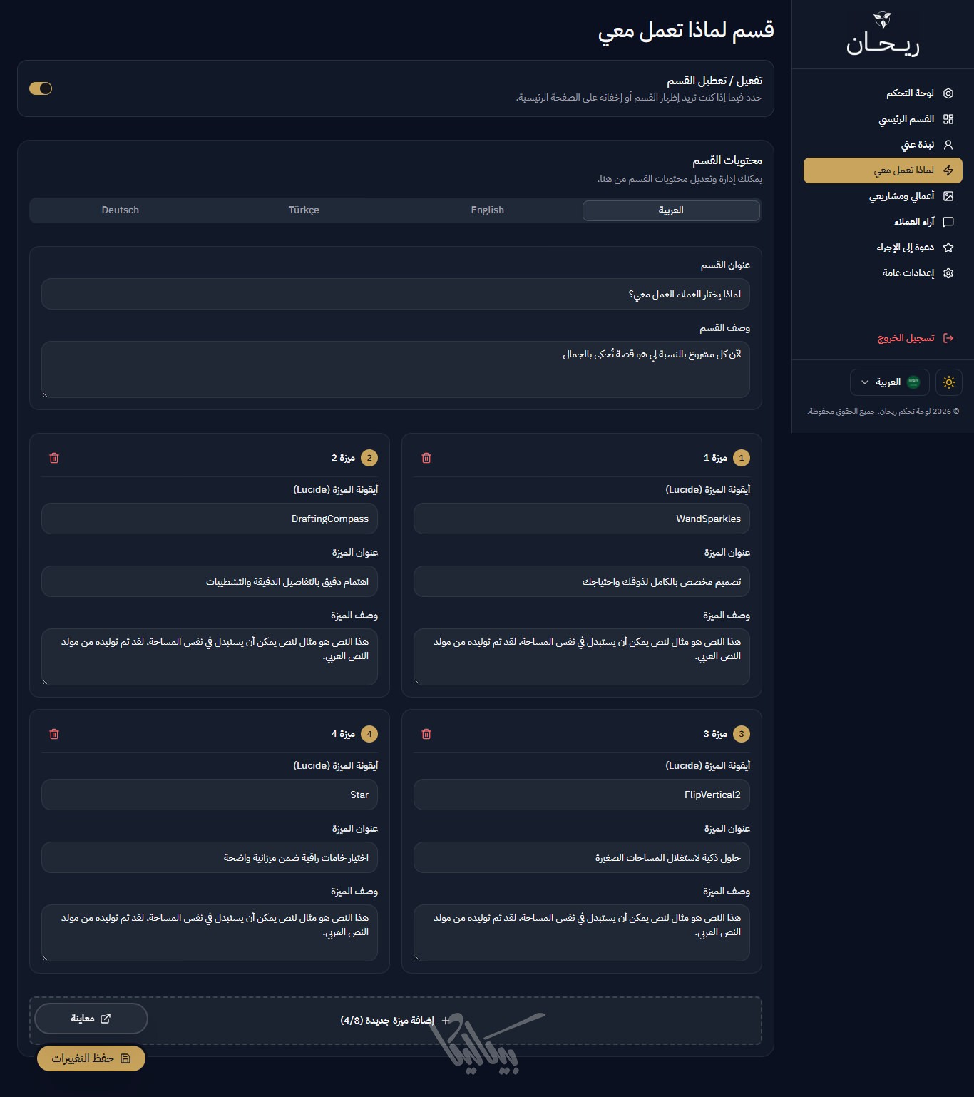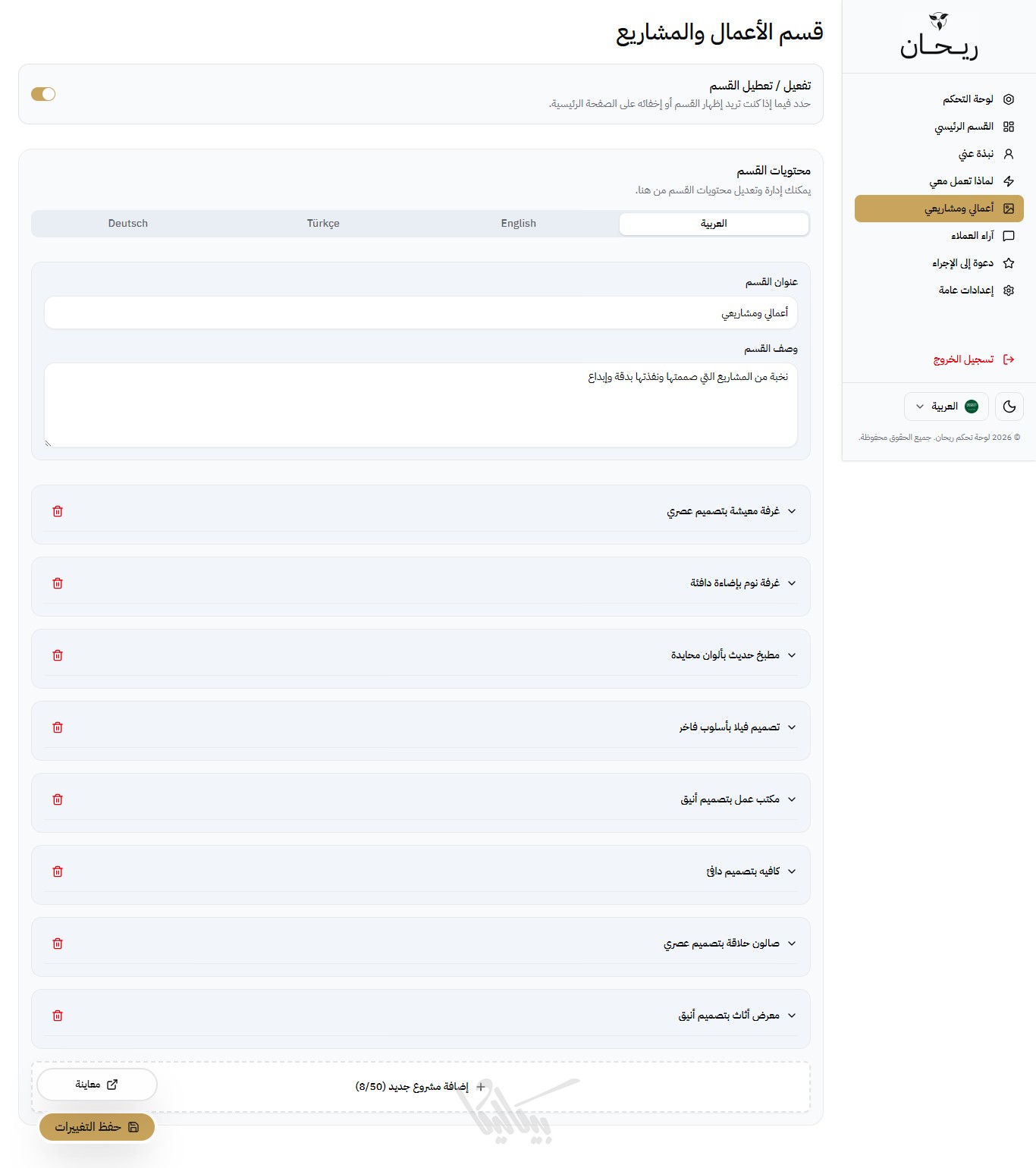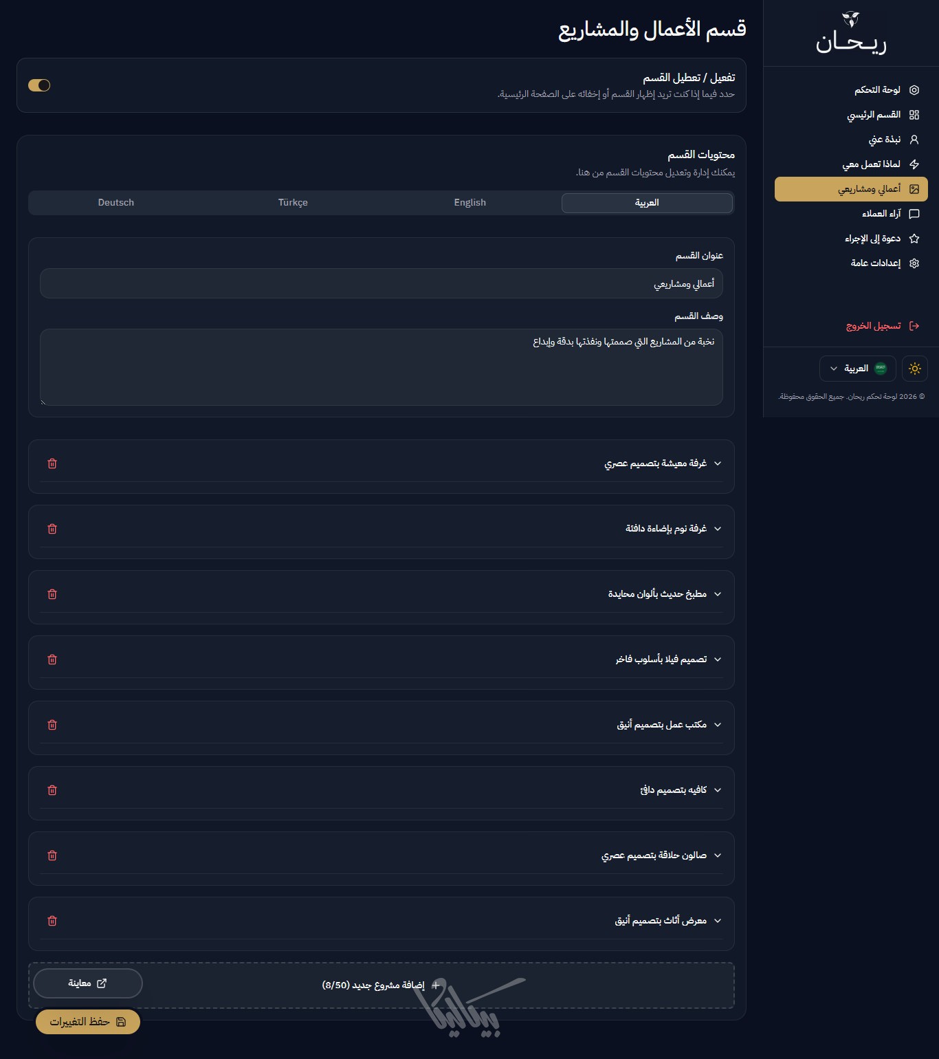 لا داعي للقلق بشأن المساحة، ريحان يدعم إضافة حتى 50 مشروعاً، ومعرض صور ضخم لكل مشروع، مع الحفاظ على سرعة أداء الصفحة وسلاسة التصفح.