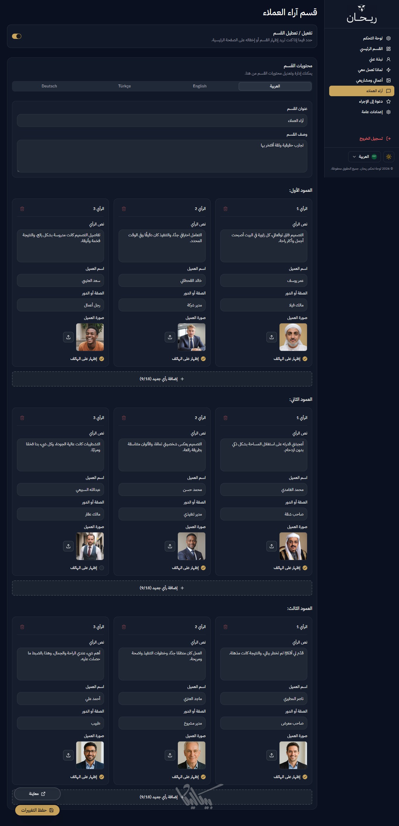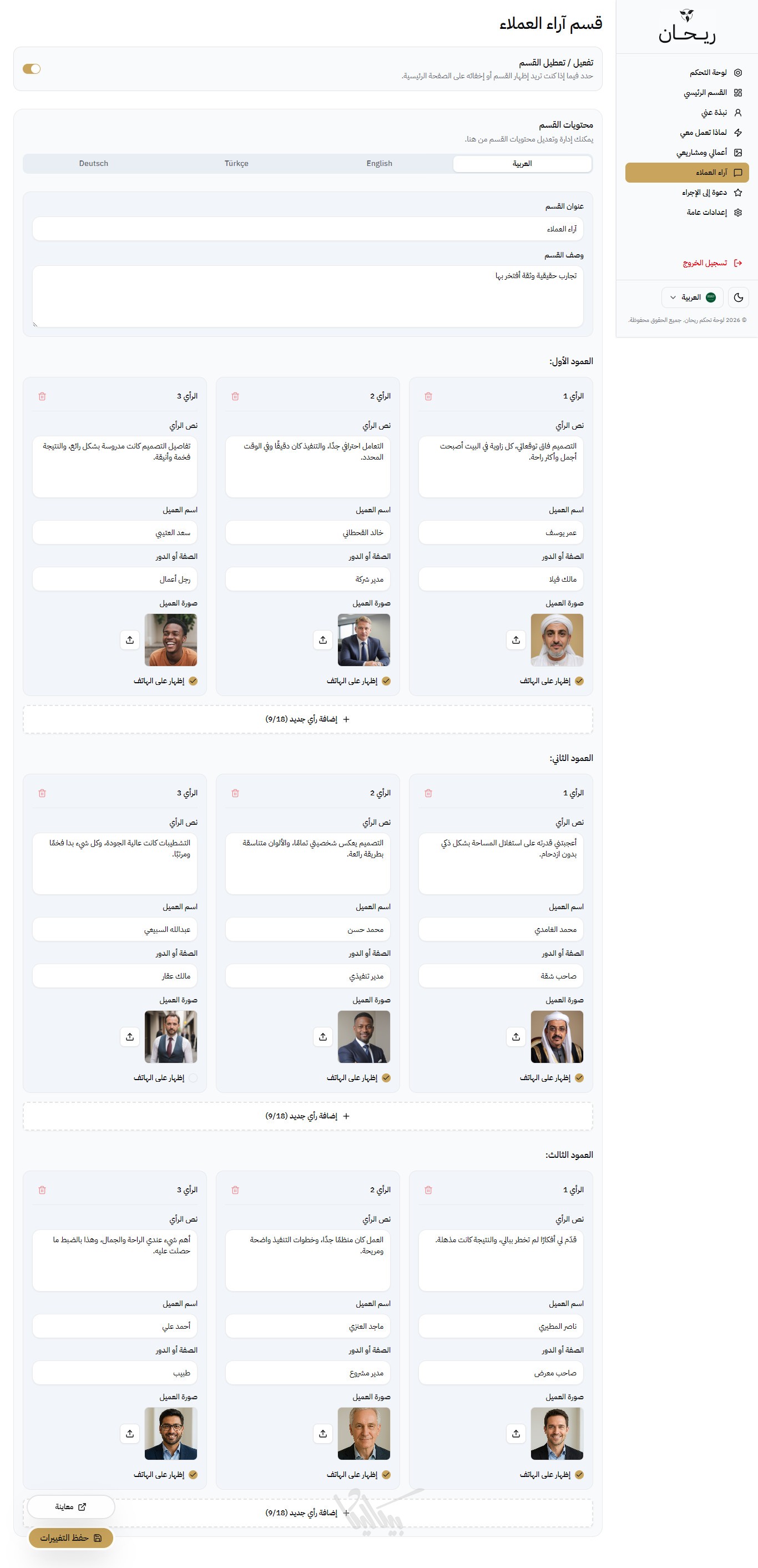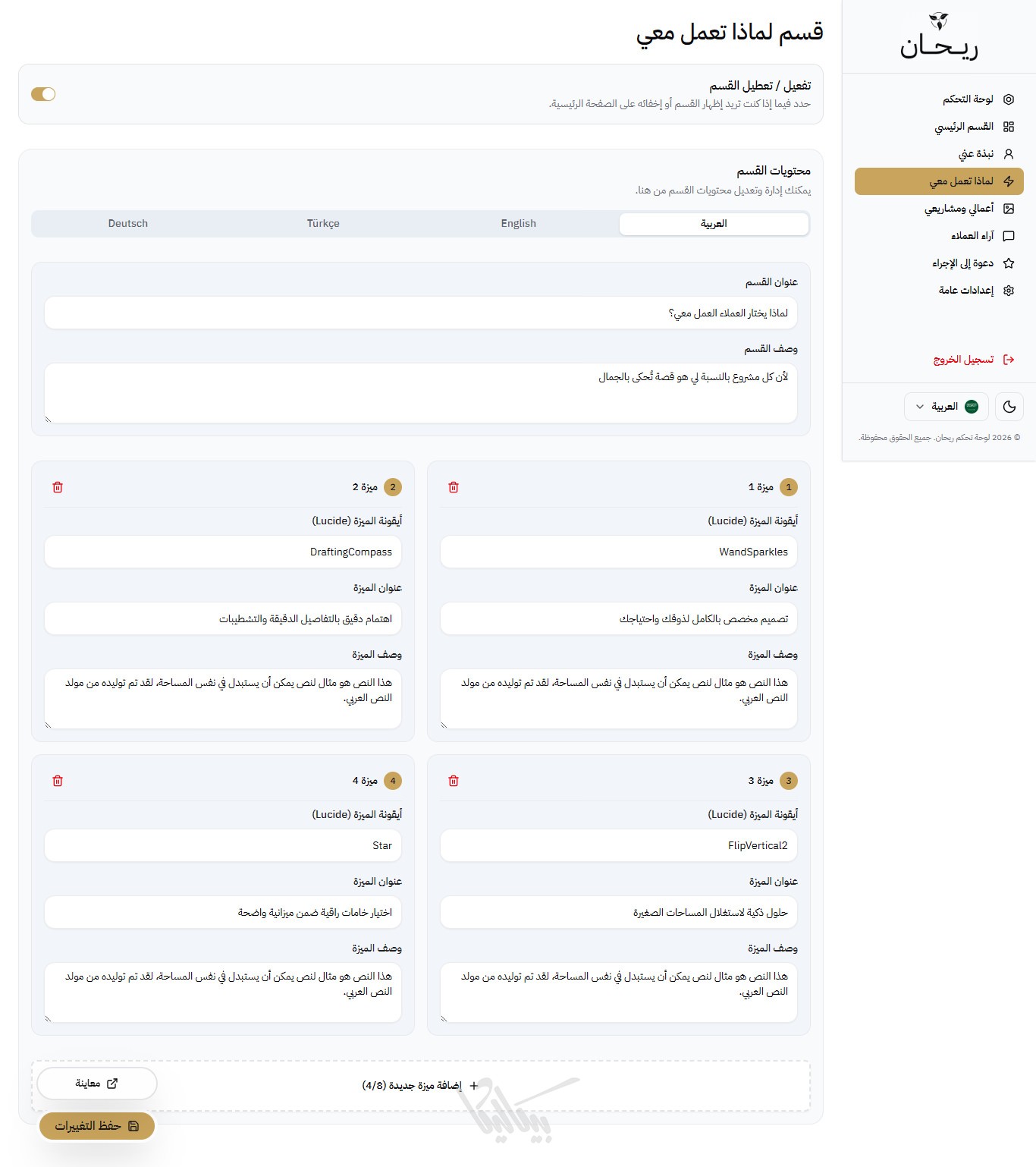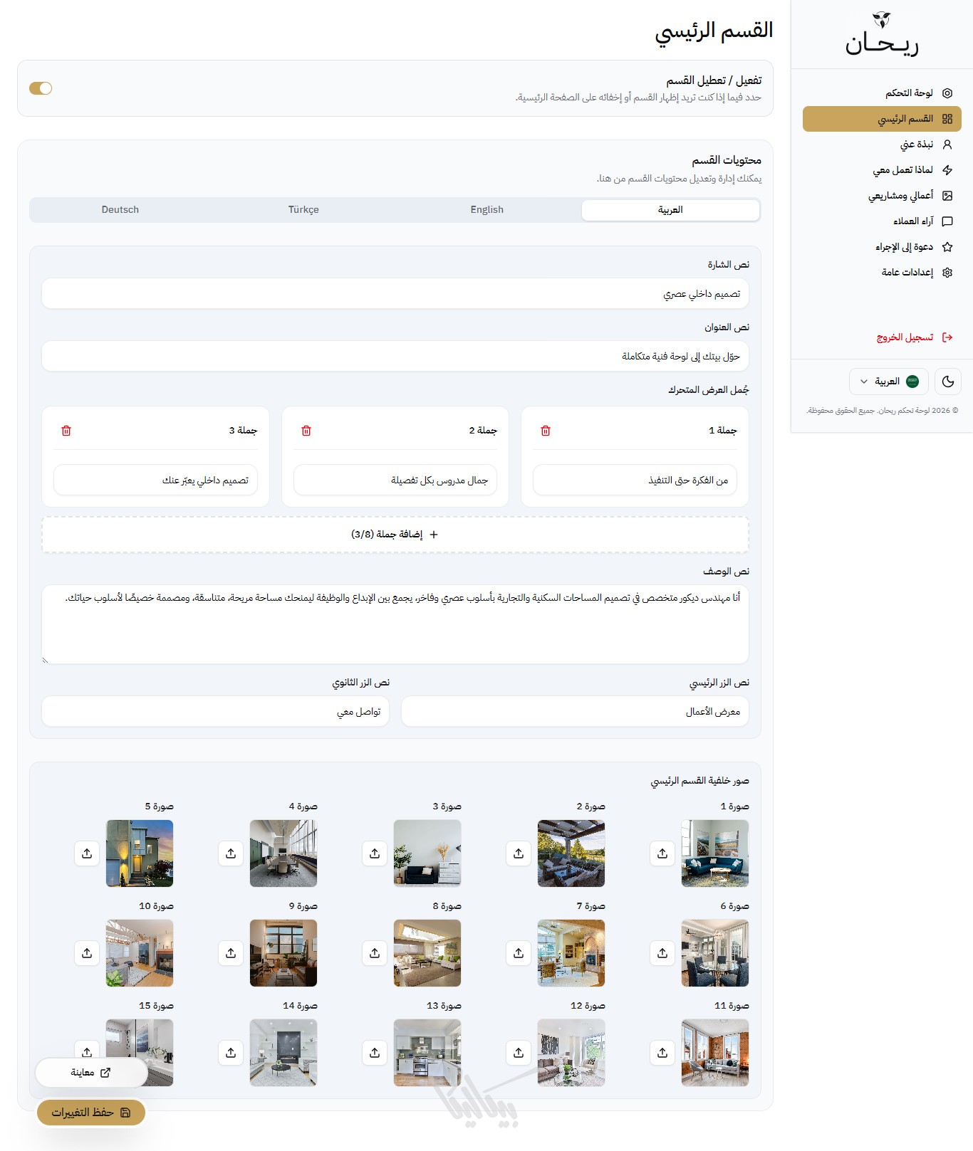 لا داعي للقلق بشأن المساحة، ريحان يدعم إضافة حتى 50 مشروعاً، ومعرض صور ضخم لكل مشروع، مع الحفاظ على سرعة أداء الصفحة وسلاسة التصفح.
