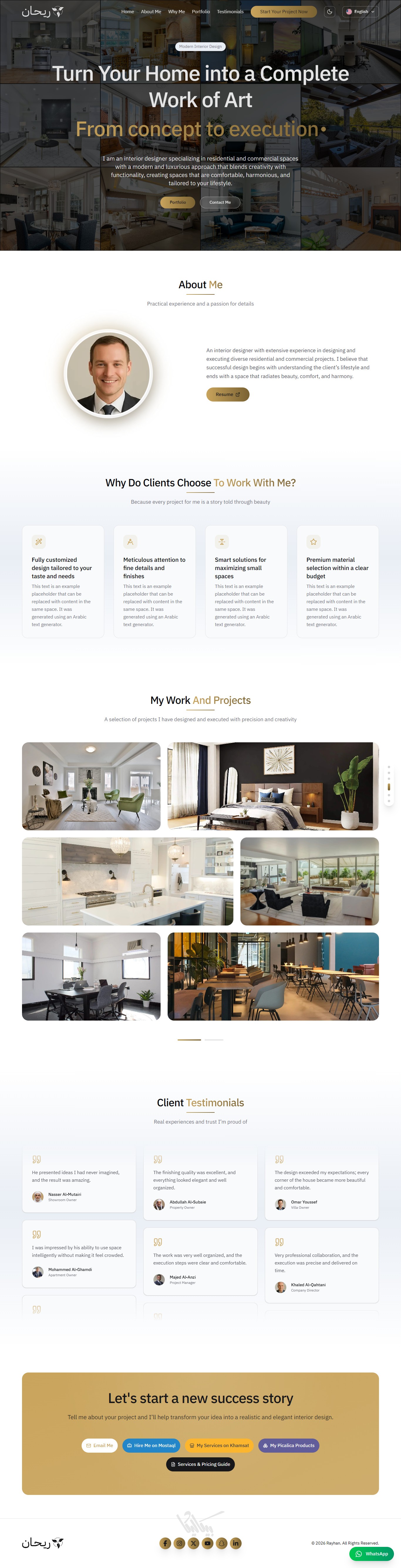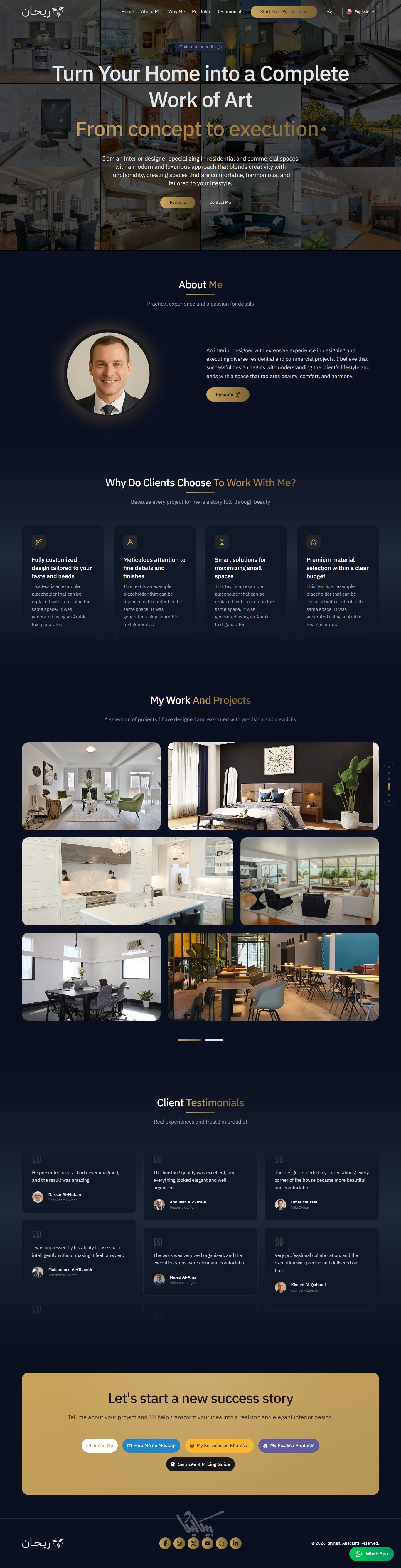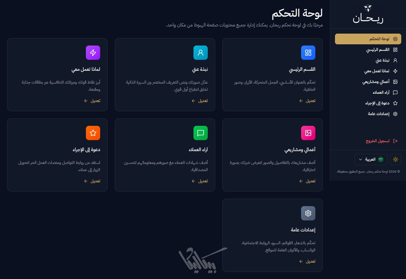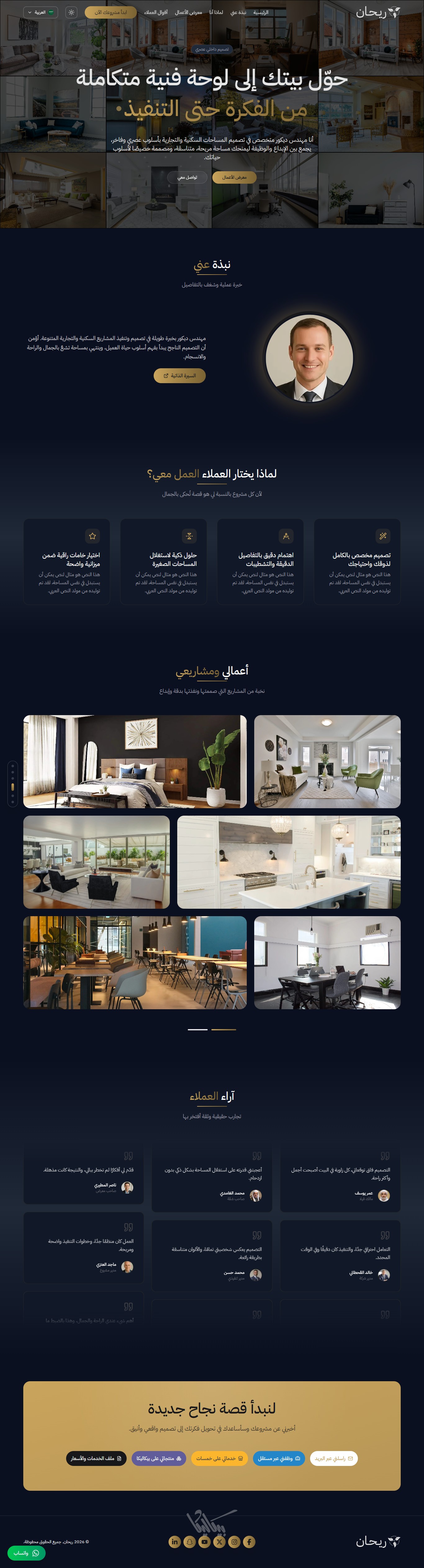 ريحان هو قالب صفحة هبوط (Landing Page) متكامل وعصري، مُصمم خصيصاً للمبدعين الذين يرغبون في عرض مشاريعهم بأسلوب تقني واحترافي، ,وإنشاء بورتفوليو يعبّر عن مهاراتهم. يوفر القالب واجهة مستخدم انسيابية مع لوحة تحكم شاملة تغني عن تعديل الكود يدوياً.