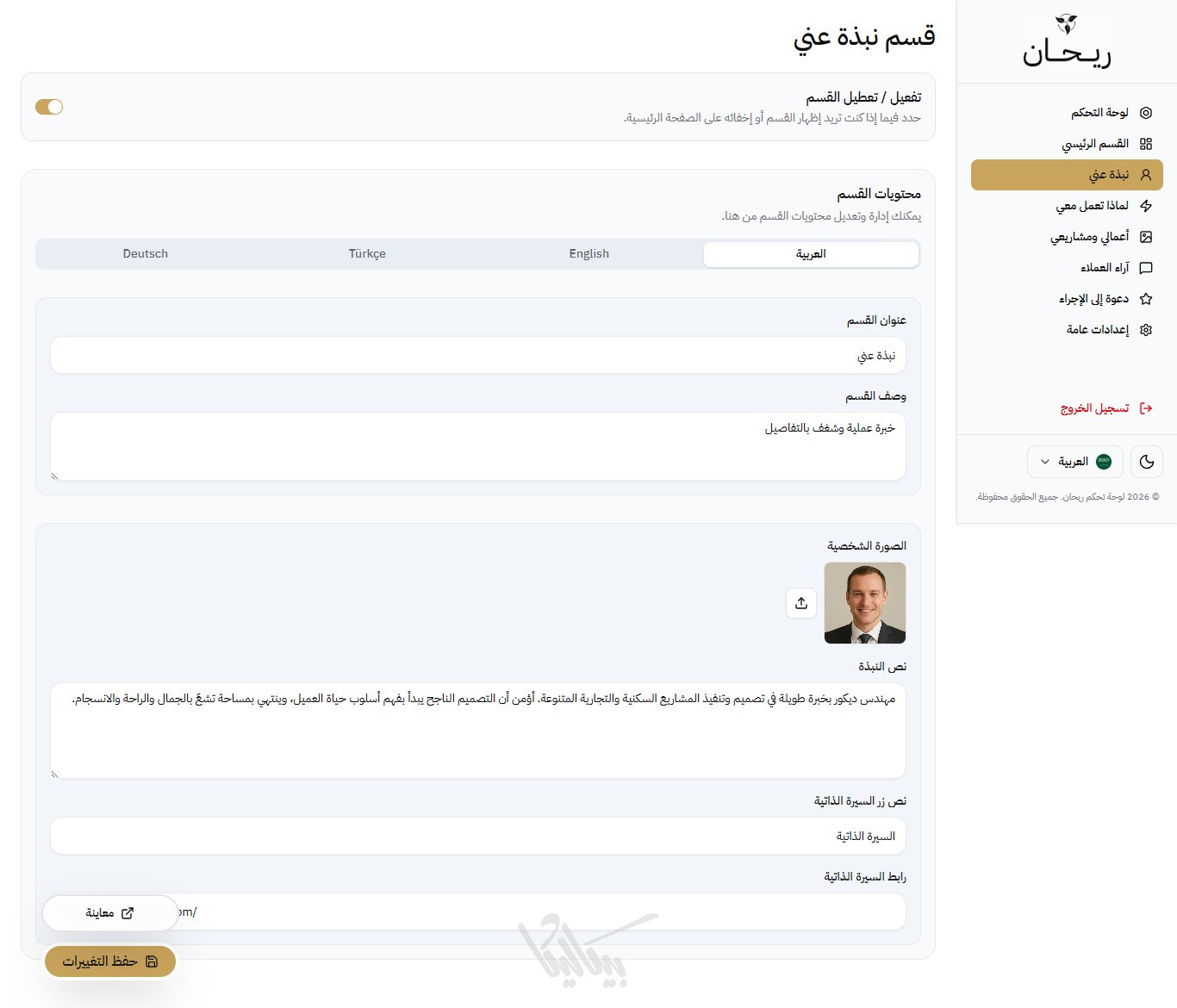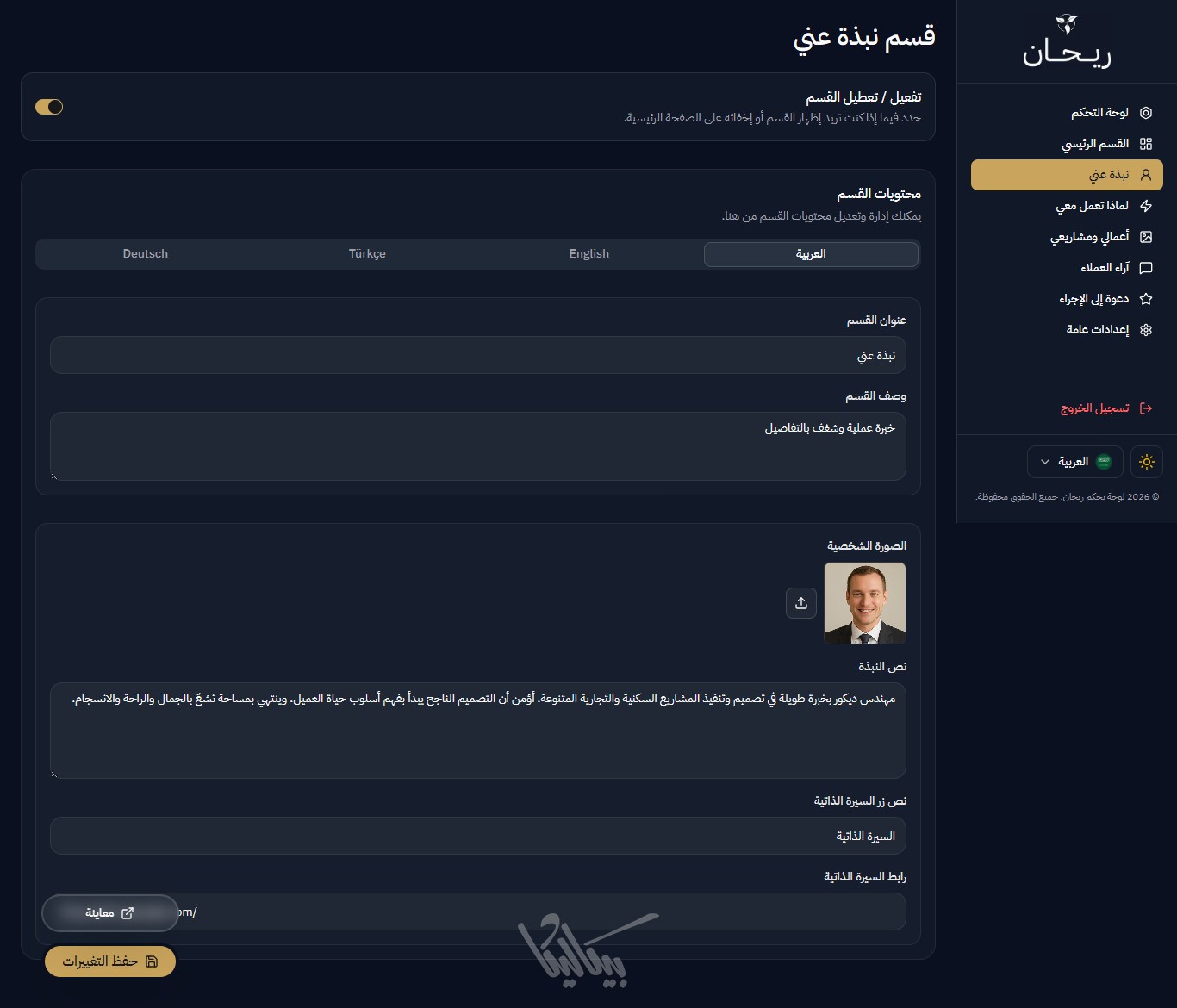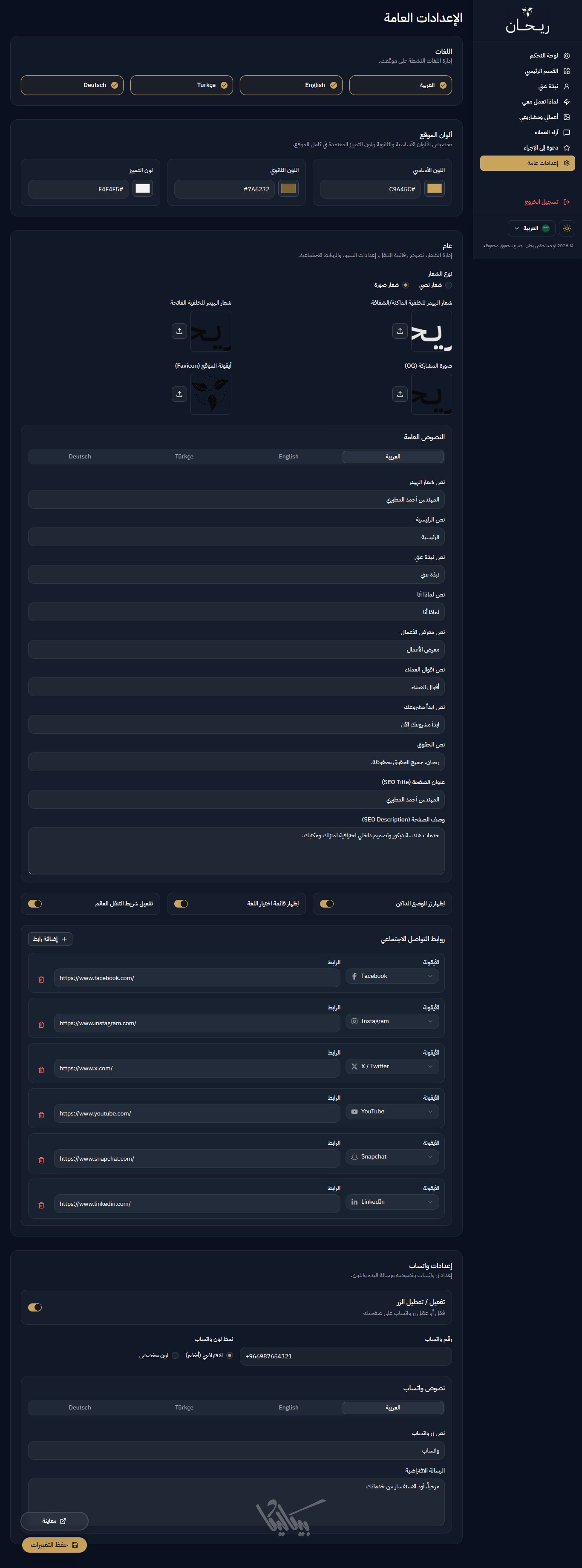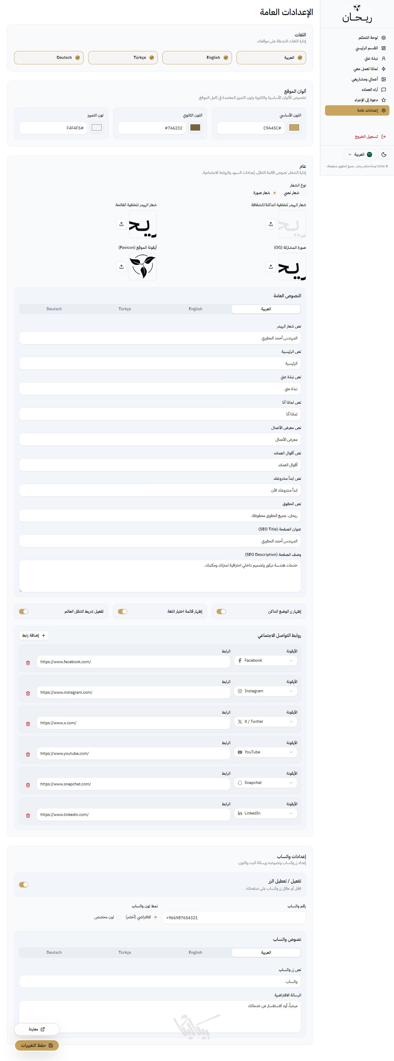 ريحان هو قالب صفحة هبوط (Landing Page) متكامل وعصري، مُصمم خصيصاً للمبدعين الذين يرغبون في عرض مشاريعهم بأسلوب تقني واحترافي، ,وإنشاء بورتفوليو يعبّر عن مهاراتهم. يوفر القالب واجهة مستخدم انسيابية مع لوحة تحكم شاملة تغني عن تعديل الكود يدوياً.