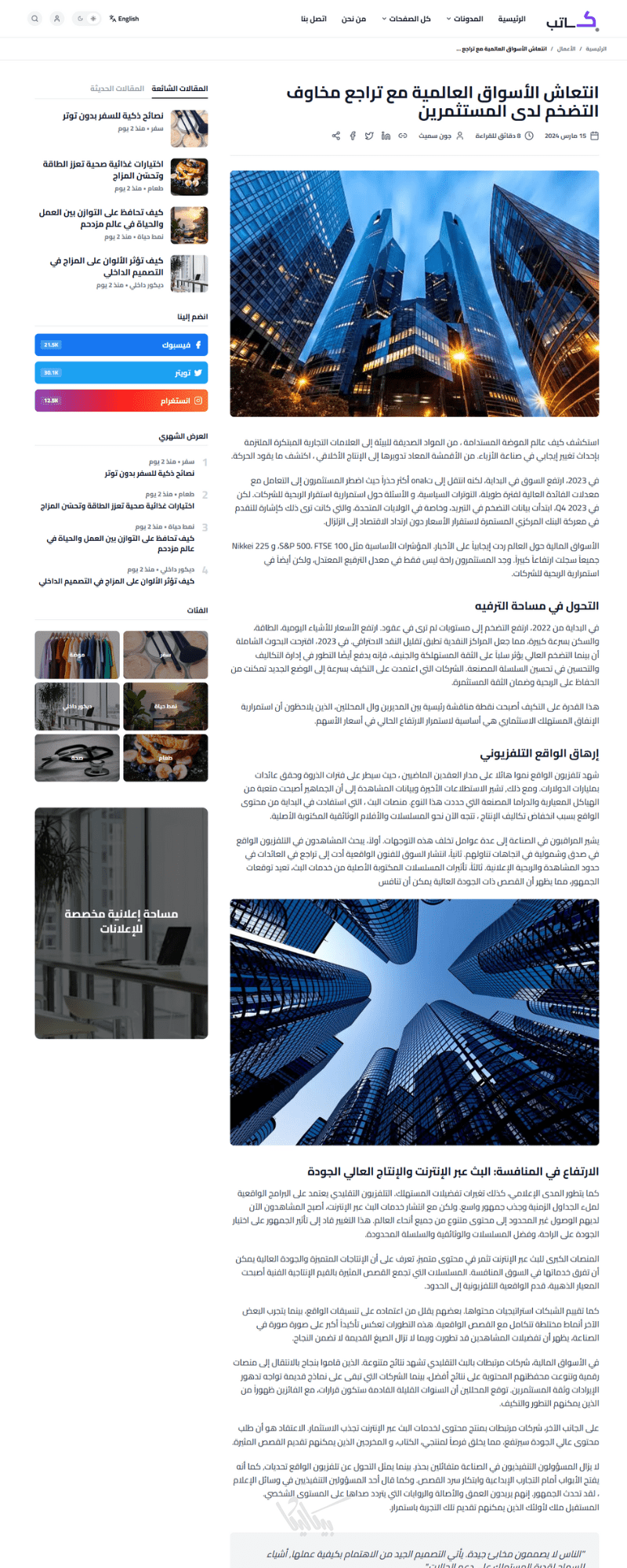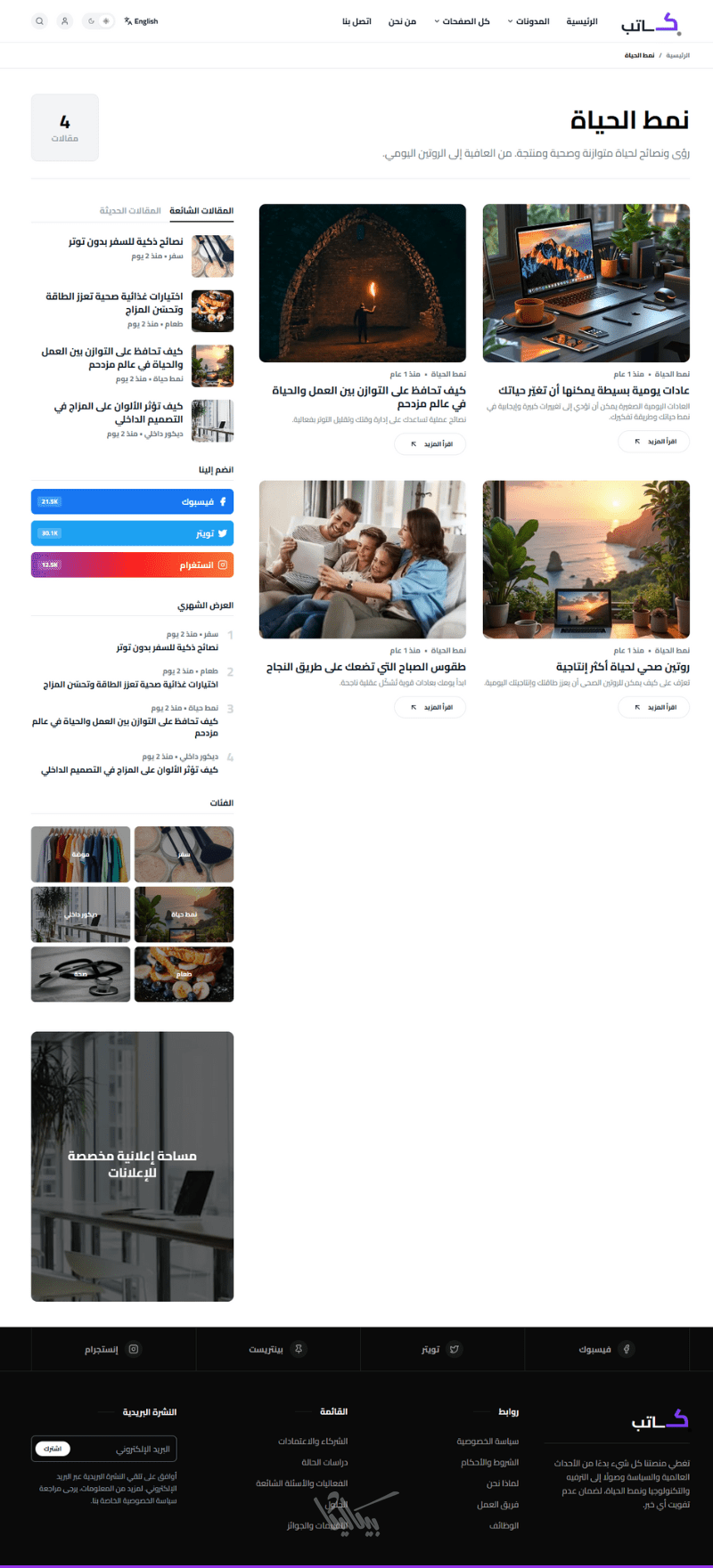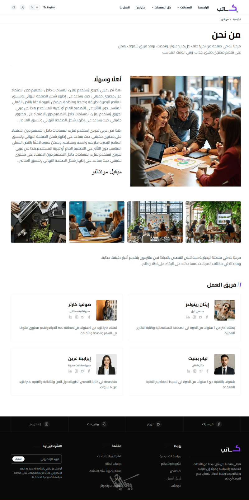 قالب كاتب هو قالب مدونة وموقع إخباري حديث وعالي الأداء، تم تطويره باستخدام أحدث تقنيات الويب ليمنحك تجربة نشر احترافية وسريعة. يُعد الخيار المثالي للمواقع الإخبارية، المدونات الشخصية، المجلات الرقمية، مواقع التكنولوجيا، المحتوى الثقافي، والمقالات المتخصصة وغيرها. تم بناء قالب كاتب باستخدام Next.js مع مراعاة أفضل ممارسات تحسين محركات البحث (SEO) والأداء، ليضمن سرعة تحميل ممتازة وتجربة مستخدم سلسة على جميع الأجهزة. يدعم القالب اللغتين العربية والإنجليزية بشكل كامل (RTL / LTR) مع إمكانية التبديل الفوري بين اللغات، بالإضافة إلى دعم الوضع الداكن والفاتح وتصميم متجاوب يعمل بكفاءة على الهواتف، التابلت، وأجهزة الكمبيوتر.