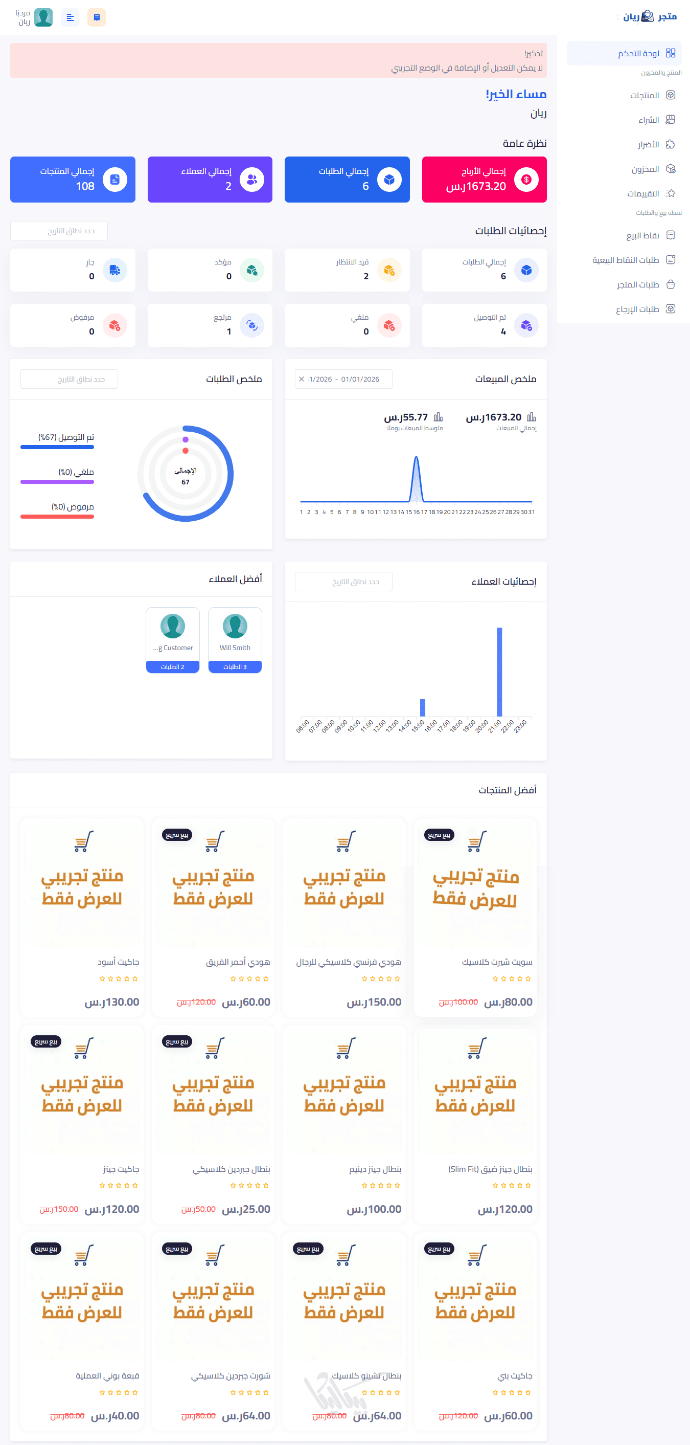 الإحصائيات السريعة تٌساعدك على متابعة إجمالي المبيعات، الطلبات، المنتجات، والعملاء من الشاشة الرئيسية. بالإضافة لملخص اليوم الذي يعرض عدد الطلبات الجديدة والمبيعات اليومية لتكون دائماً على اطلاع. بجانب تقارير المبيعات.