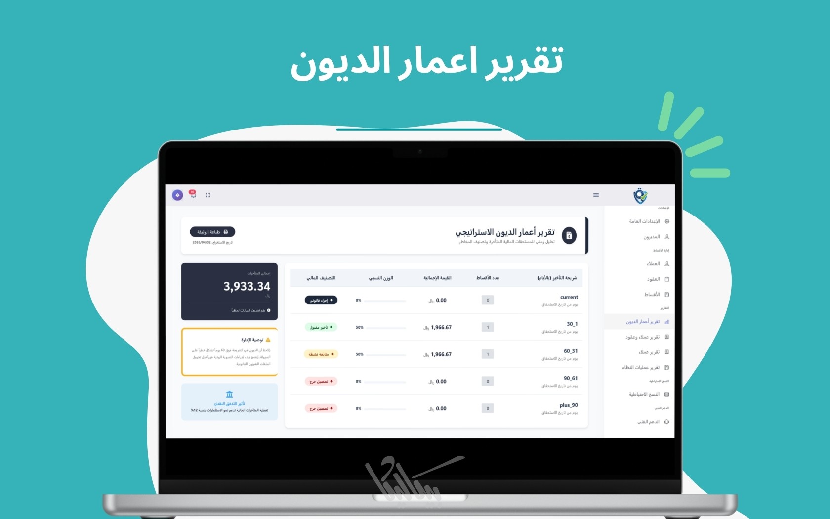 لوحة مراقبة للأقساط المستحقة اليوم والمتأخرة، لتسهيل عملية المتابعة مع العملاء وضمان التدفق المالي.