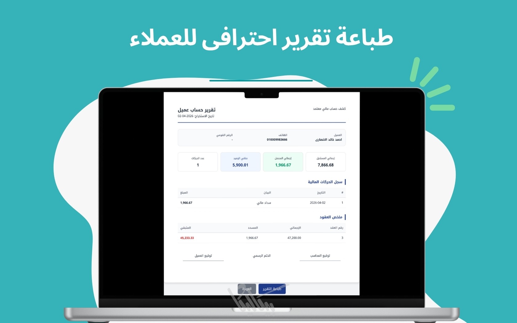 إنشاء عقود تقسيط احترافية مع تحديد قيمة المنتج، المقدم، ونسبة الربح، ليقوم النظام بحساب الإجمالي تلقائياً.