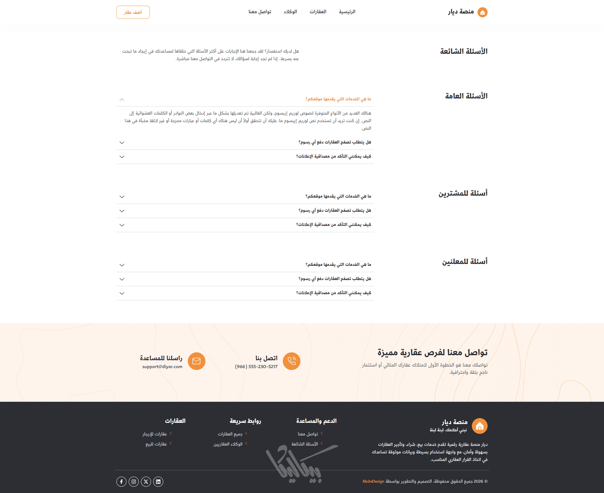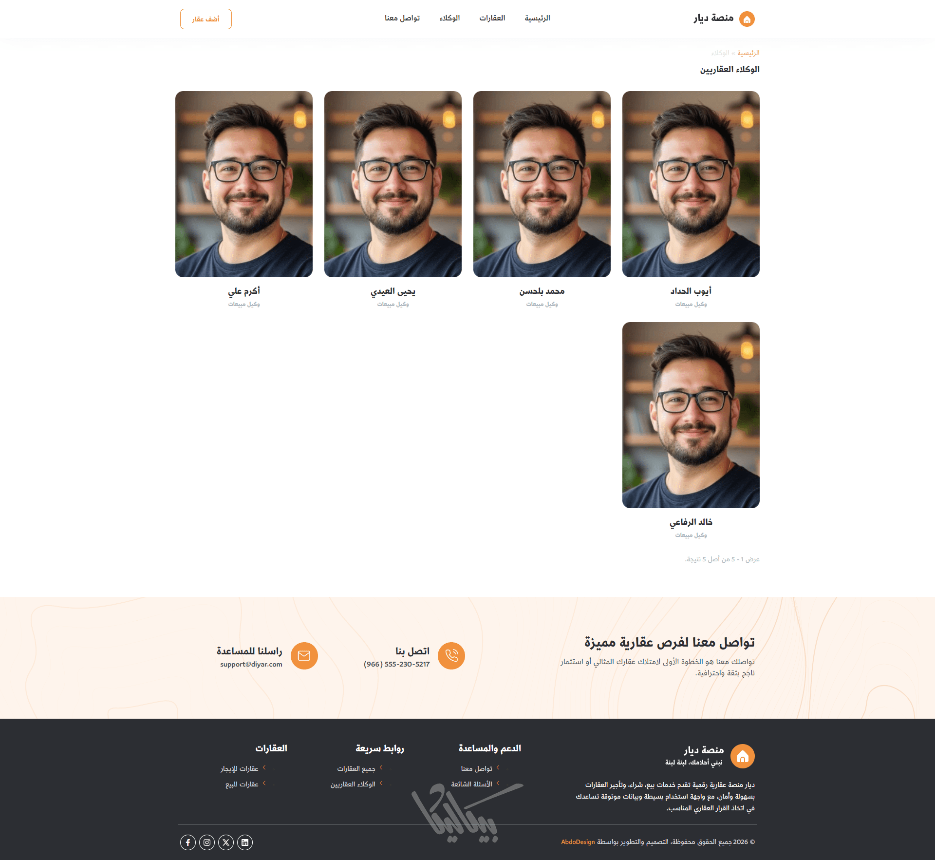 إمكانية إضافة وكلاء عقاريين مع عرض بياناتهم الخاصة، مما يعزز المصداقية ويسهّل على العملاء التواصل مع الوكيل المناسب.