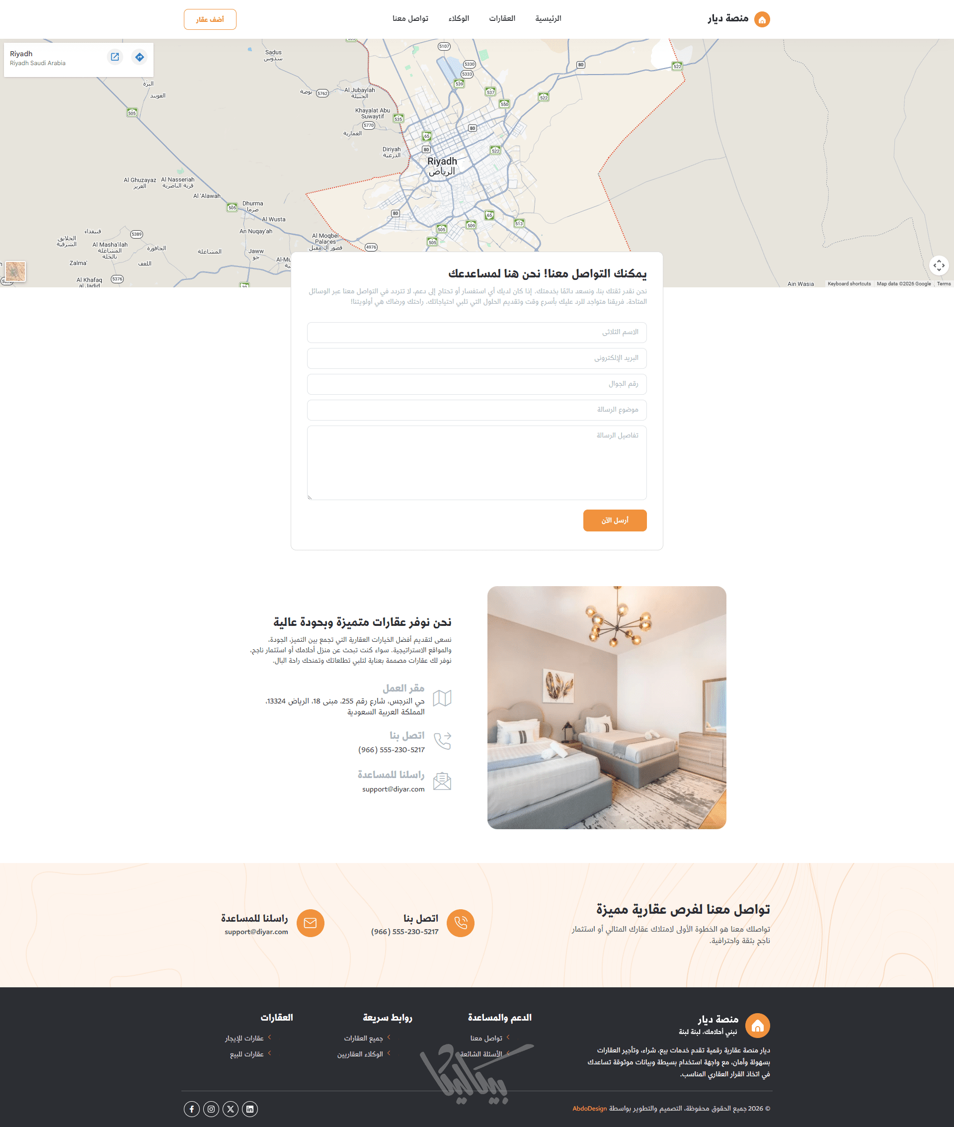 ديار هو قالب ووردبريس عربي مصمم خصيصًا لقطاع العقارات، يمنحك كل ما تحتاجه لإنشاء موقع عقاري متكامل بسهولة ومرونة. يجمع القالب بين التصميم العصري والأداء السريع، مع نظام متطور لإدارة وعرض العقارات بشكل احترافي يجذب الزوار ويحوّلهم إلى عملاء.